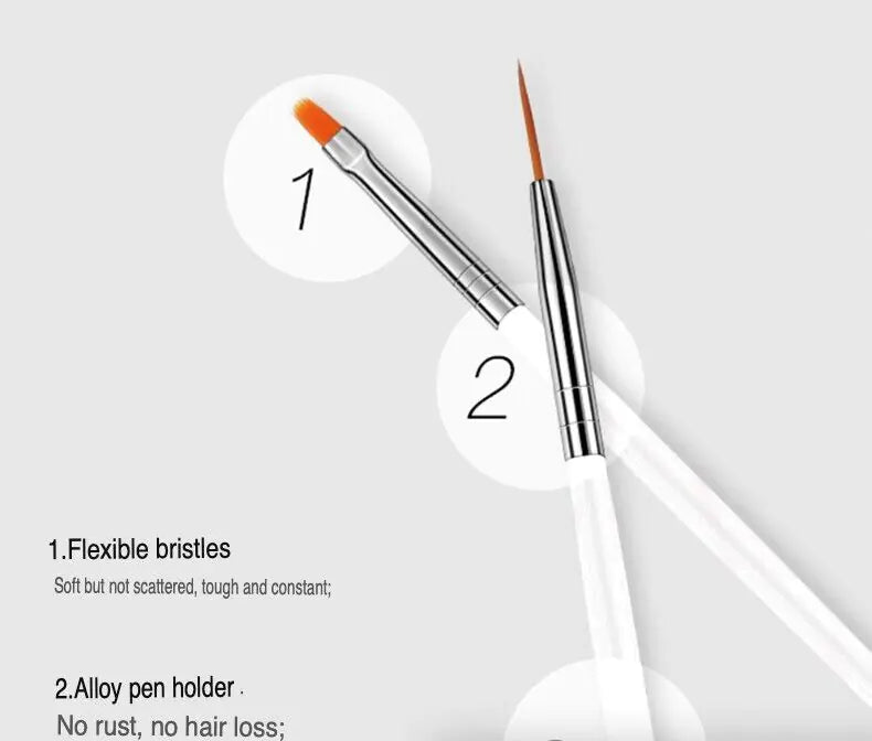 15pcs gel nail art painting drawing brushes including dotting tool, angle brush, fan brush, sanding brush, flat brush, painting brush, striping brush and drawing brush for drawing fine nail art. Can meet your all nail art needs.